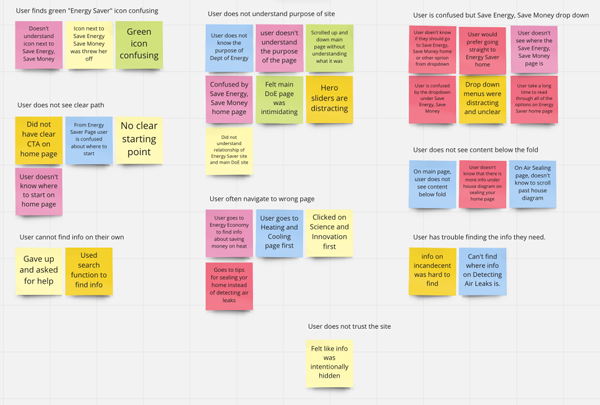 I knew it was important for users to be able to find information on conserving energy that would be useful to them. One of the biggest challenges I faced was the amount of information on the Energy Saver site. I read through over 100 pages of information and that didn’t even include some child pages and external links. (If you need to know how to build a micro hydroelectric dam hit me up!) A lot of the information that I found would be difficult to categorize to someone without special knowledge of certain topics. Since my target user persona would not likely have this kind of knowledge sorting the information was difficult. I used Miro to input all of the page topics and began sorting.