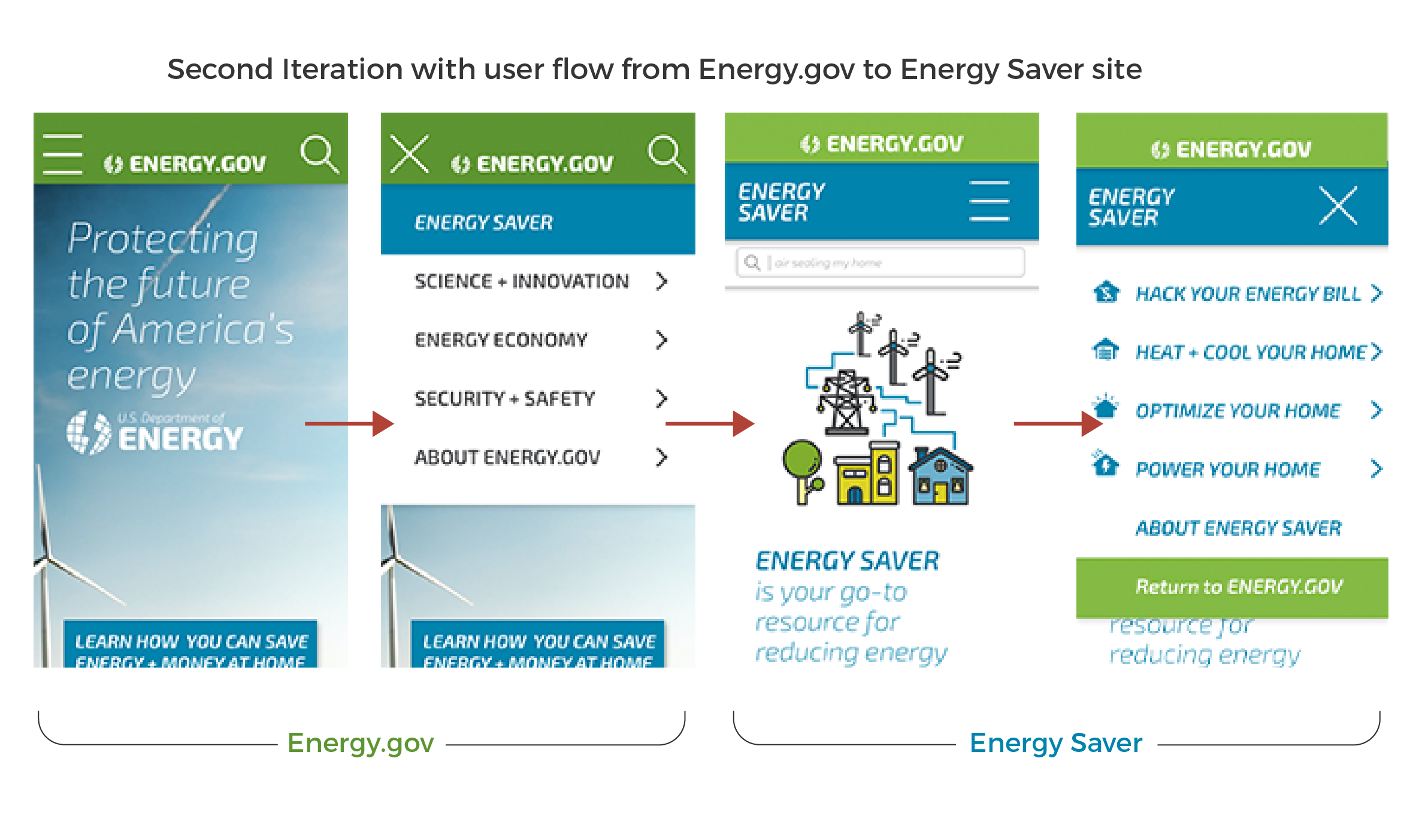 I did find that in testing some users still had trouble in navigating between the Energy.gov site and Energy Saver site, specifically on the mobile site. When users clicked on the hamburger menu and then the Energy Saver item it took them to the Energy Saver page. But the hamburger menu for the Energy Saver page was very close to where the previous page was. Users expected that to be the same menu they had just seen on the Energy.gov page.