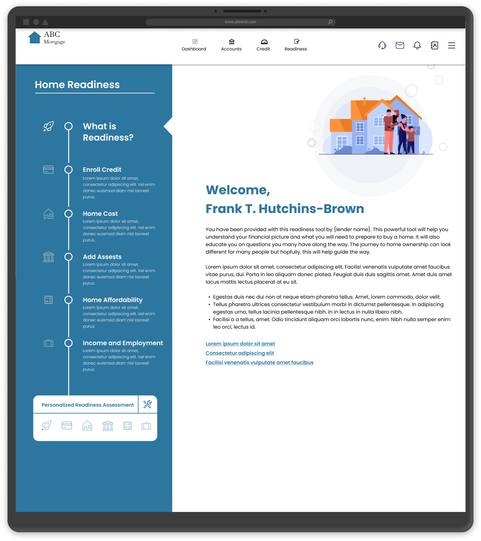 FinLocker is a white label financial fitness platform that is designed to help first time home buyers prepare for buying a home. It also is a way to increase engagement between lenders and prospective customers. I was asked to take ownership of one of the primary functions of the platform, the readiness assessment. I worked primarily on the web designs but also gave thought to mobile as well.