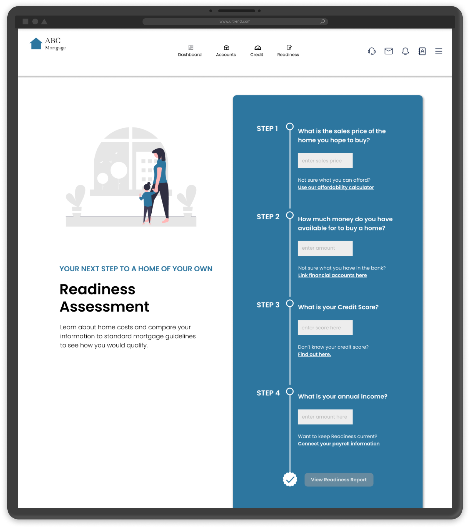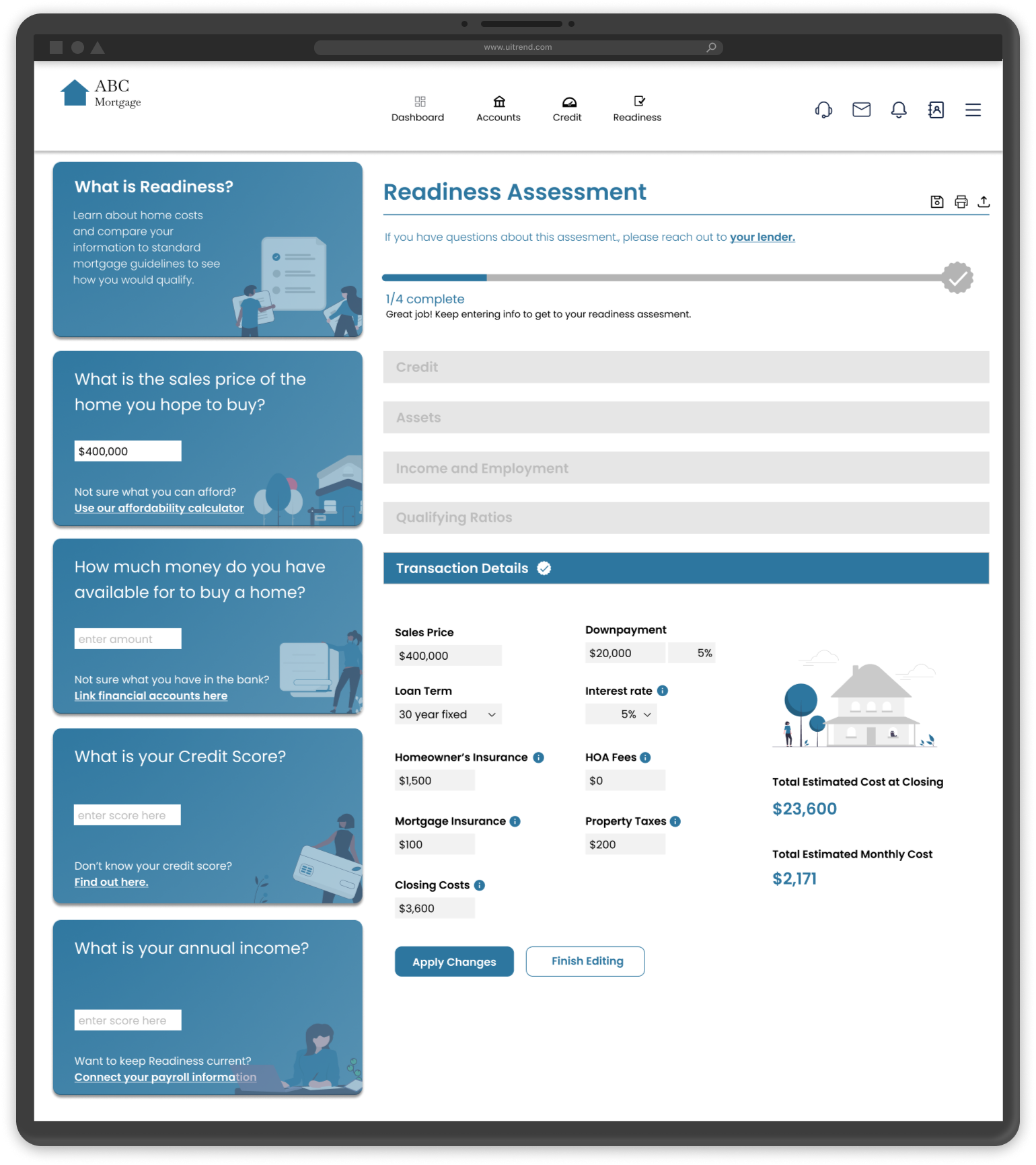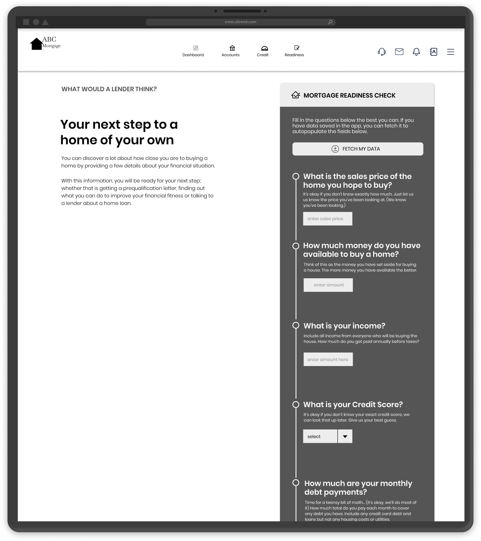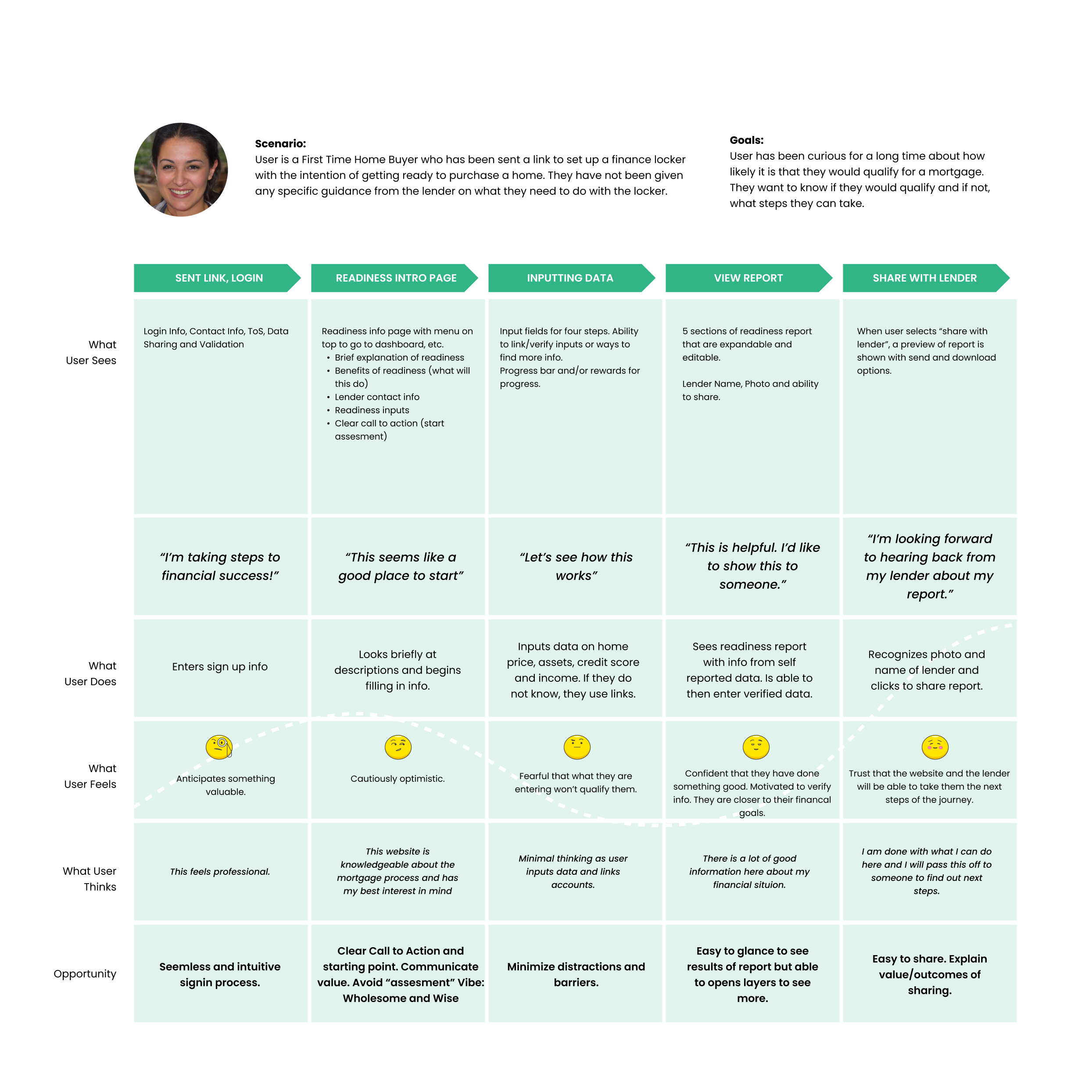 The design process was a little bit different for this project since this was an existing product that was getting a major overhaul as opposed to a new product. In the current state, users would link different pieces of financial data into their "locker" and it would give them insights on what kind of home loan they would qualify for. Since it was a startup and the design function was new, I was one of the first UX Designers to work with the readiness tool.