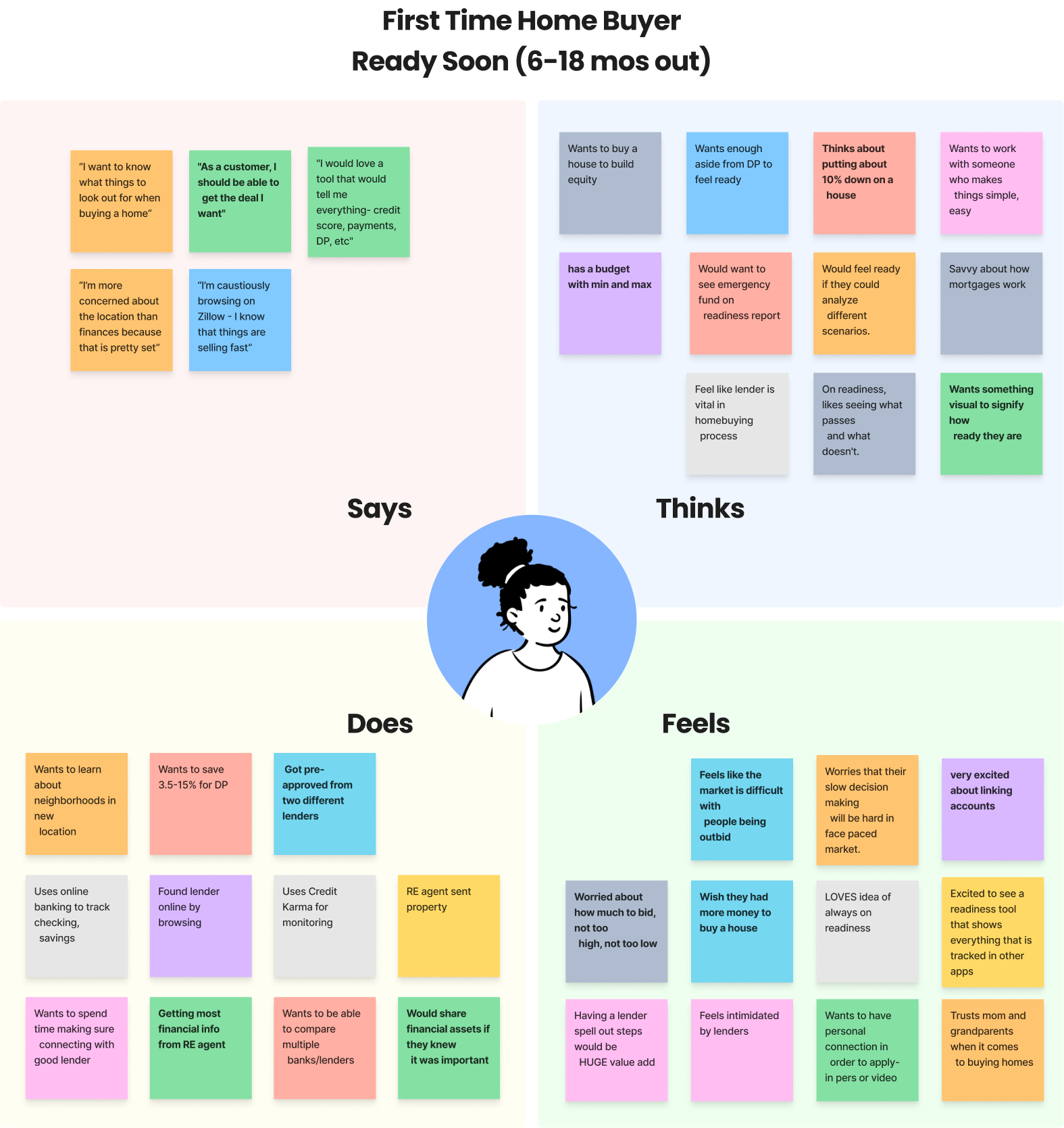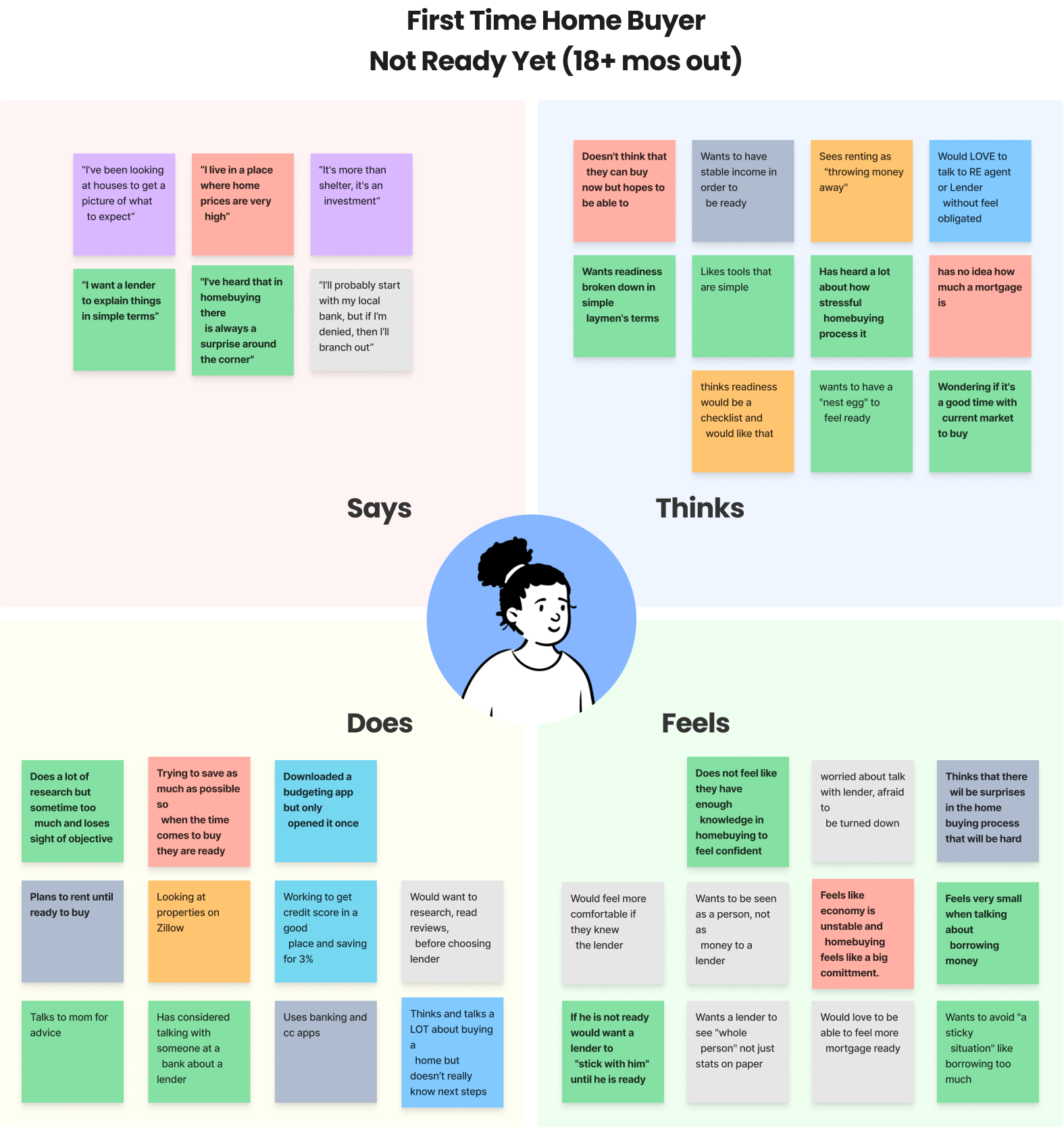 With her absence, I took the opportunity to better understand the user by reviewing previous user research. We had a backlog of interviews that I went back and watched and took notes on. I arranged my notes into two empathy maps along with an archetype. One for a first time home buyer who was greater than 18 months from buying a home and one for a first time home buyer that was 6-18 months from buying a home.